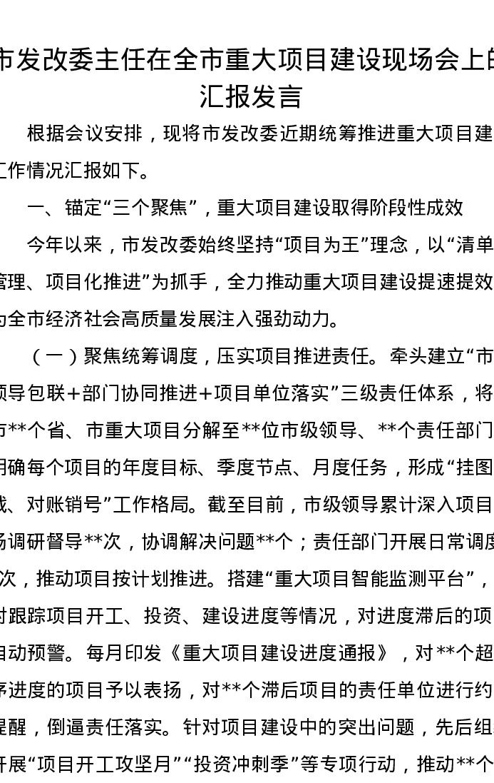 市发改委主任在全市重大项目建设现场会上的汇报发言