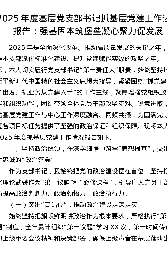 2025年度基层党支部书记抓基层党建工作述职报告:强基固本筑堡垒 凝心聚力促发展