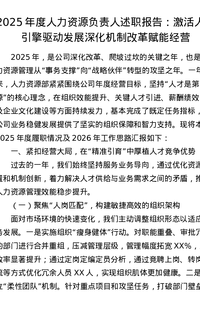 2025年度人力资源负责人述职报告:激活人才引擎驱动发展 深化机制改革赋能经营