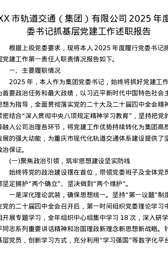 XX市轨道交通(集团)有限公司2025年度党委书记抓基层党建工作述职报告