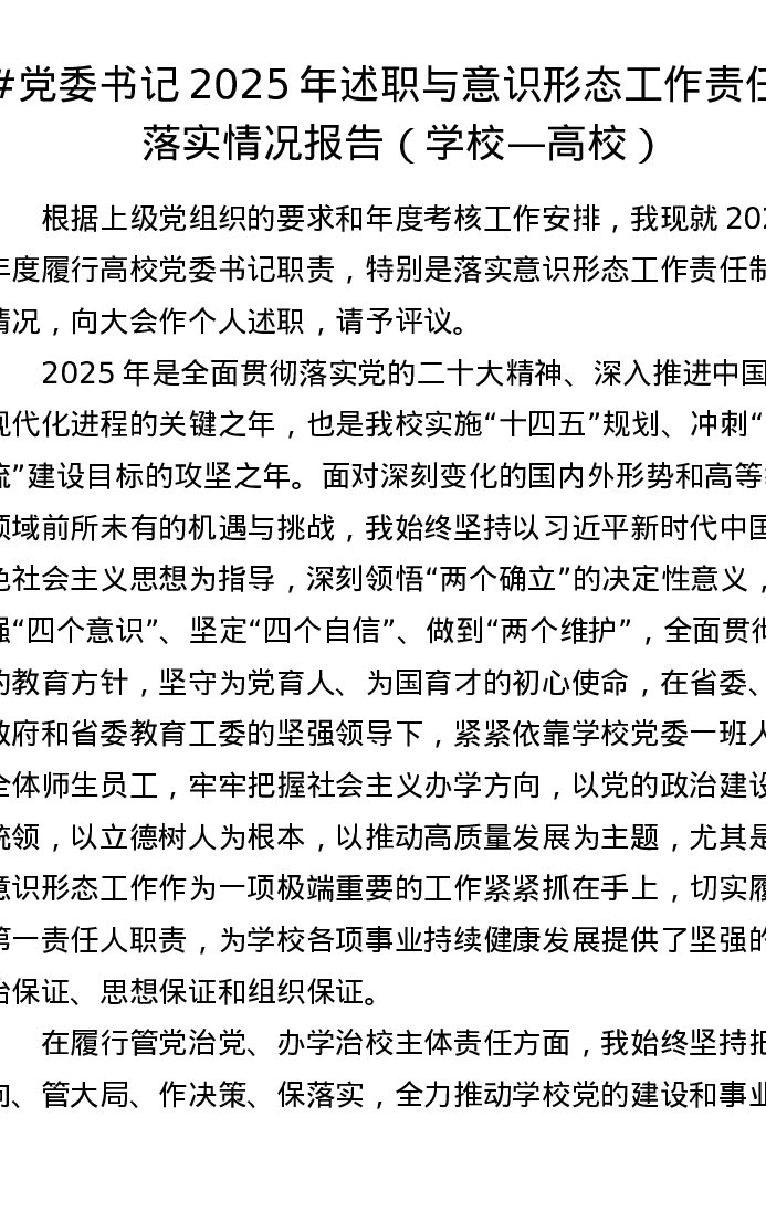 党委书记2025年述职与意识形态工作责任制落实情况报告(学校—高校)
