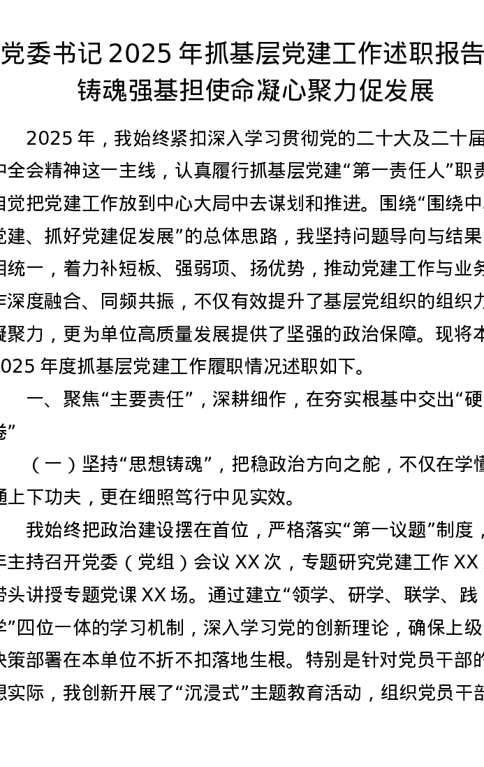 党委书记2025年抓基层党建工作述职报告:铸魂强基担使命 凝心聚力促发展