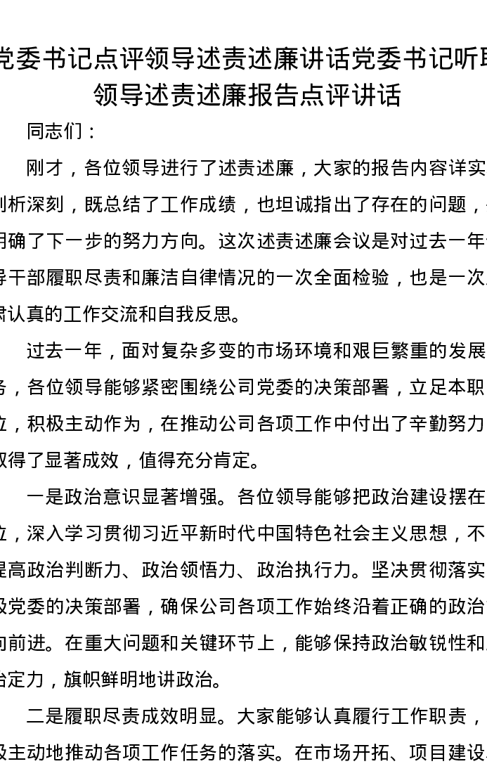 党委书记点评领导述责述廉讲话党委书记听取领导述责述廉报告点评讲话