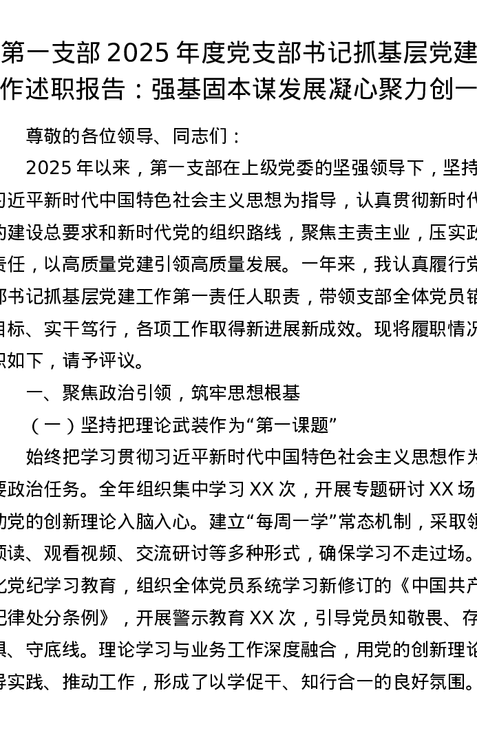 第一支部2025年度党支部书记抓基层党建工作述职报告:强基固本谋发展 凝心聚力创一流