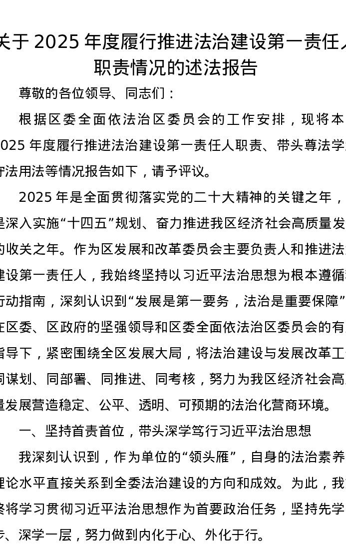 关于2025年度履行推进法治建设第一责任人职责情况的述法报告