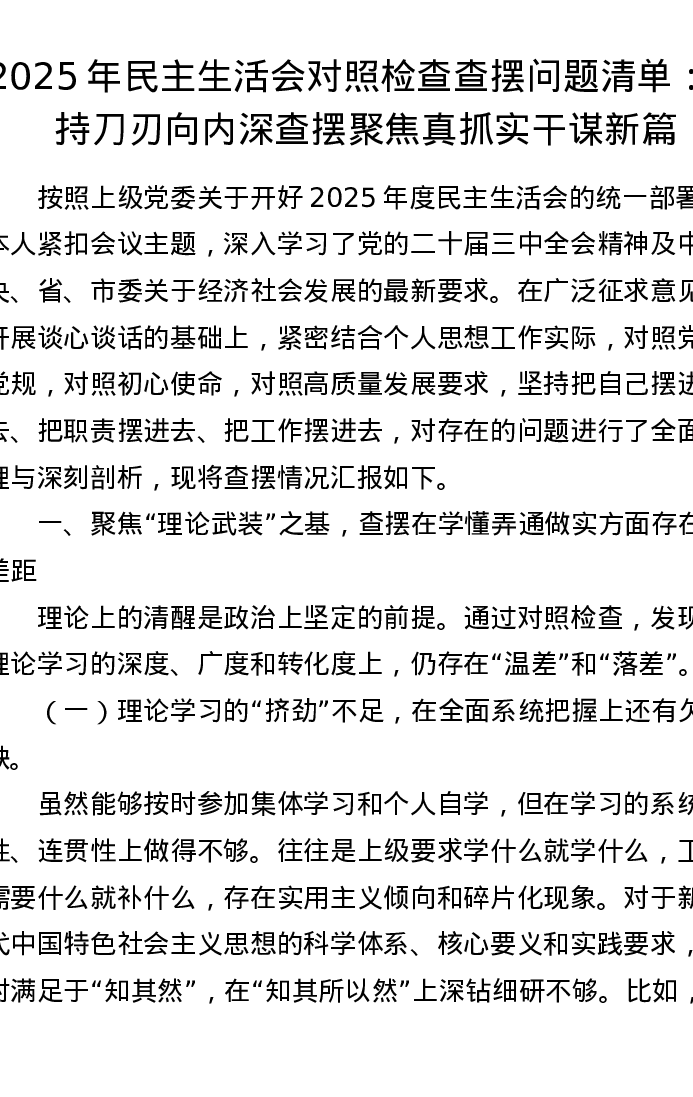 2025年xxxxx对照检查查摆问题清单:坚持刀刃向内深查摆 聚焦真抓实干谋新篇