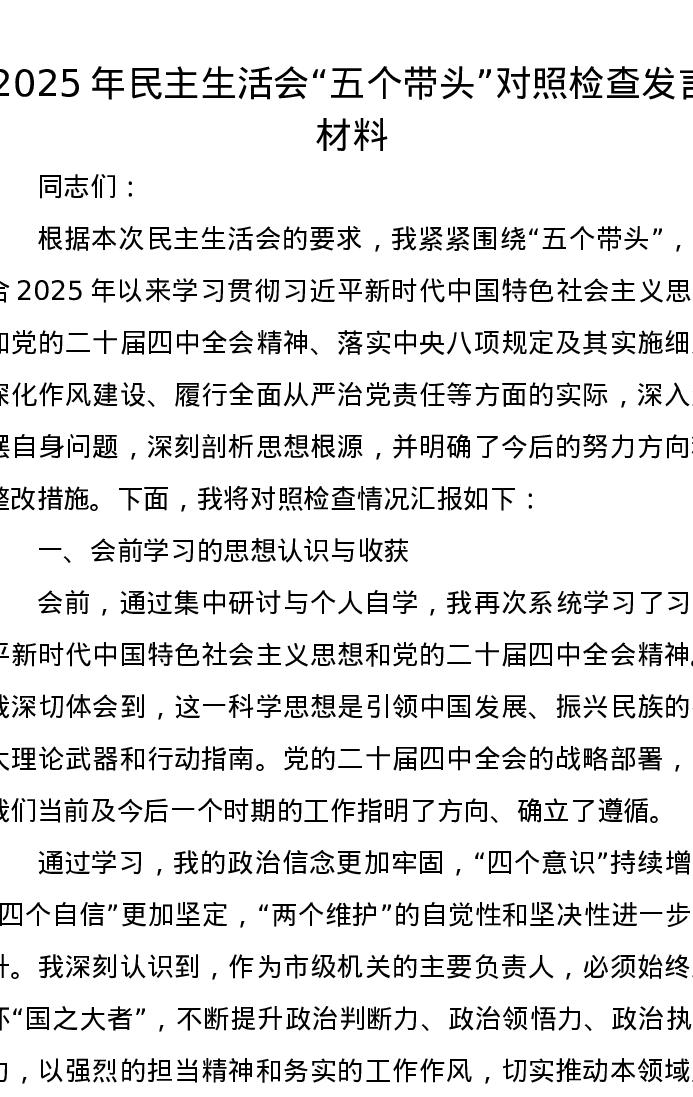 2025年xxxxx五个带头对照检查发言材料(通用稿)