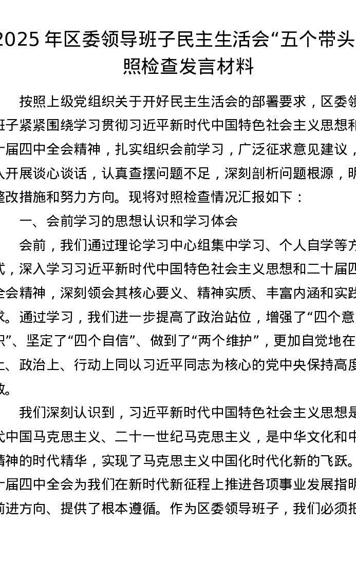 2025年区委领导班子xxxxx五个带头对照检查发言材料