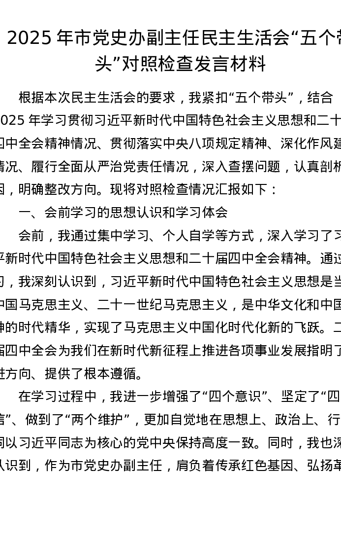 2025年市党史办副主任xxxxx五个带头对照检查发言材料