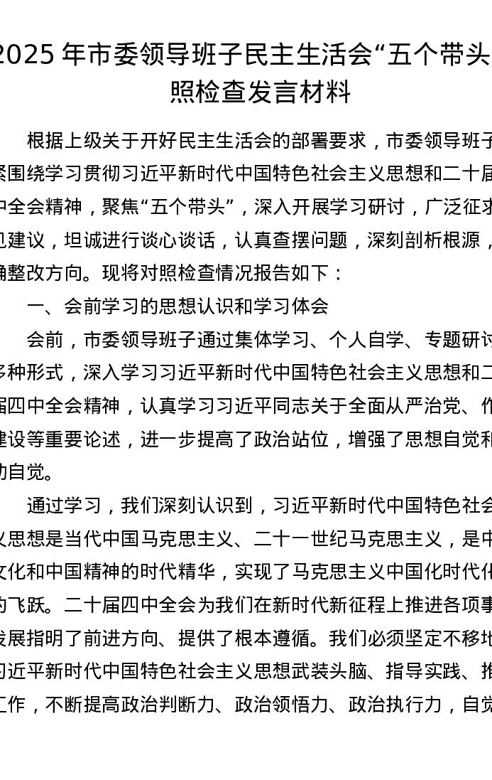 2025年市委领导班子xxxxx五个带头对照检查发言材料