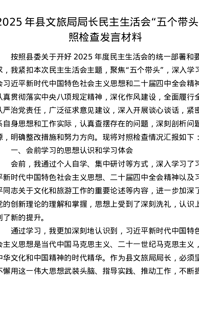 2025年县文旅局局长xxxxx五个带头对照检查发言材料