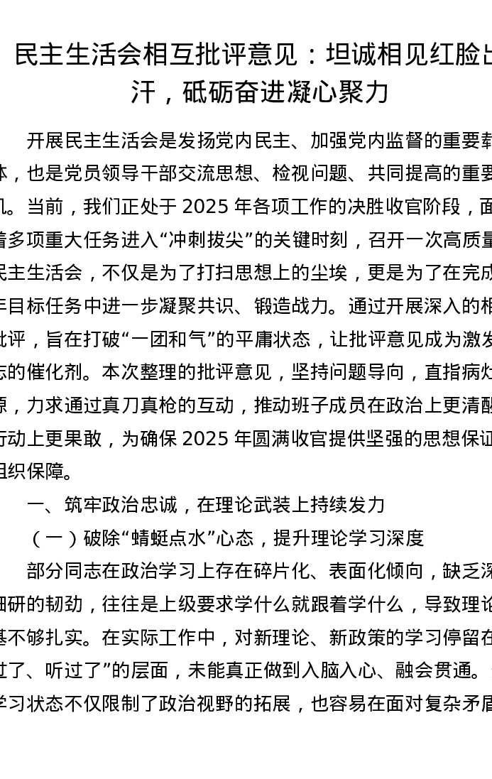 xxxxx相互批评意见:坦诚相见红脸出汗,砥砺奋进凝心聚力