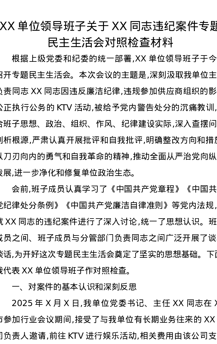 XX单位领导班子关于XX同志违纪案件专题xxxxx对照检查材料