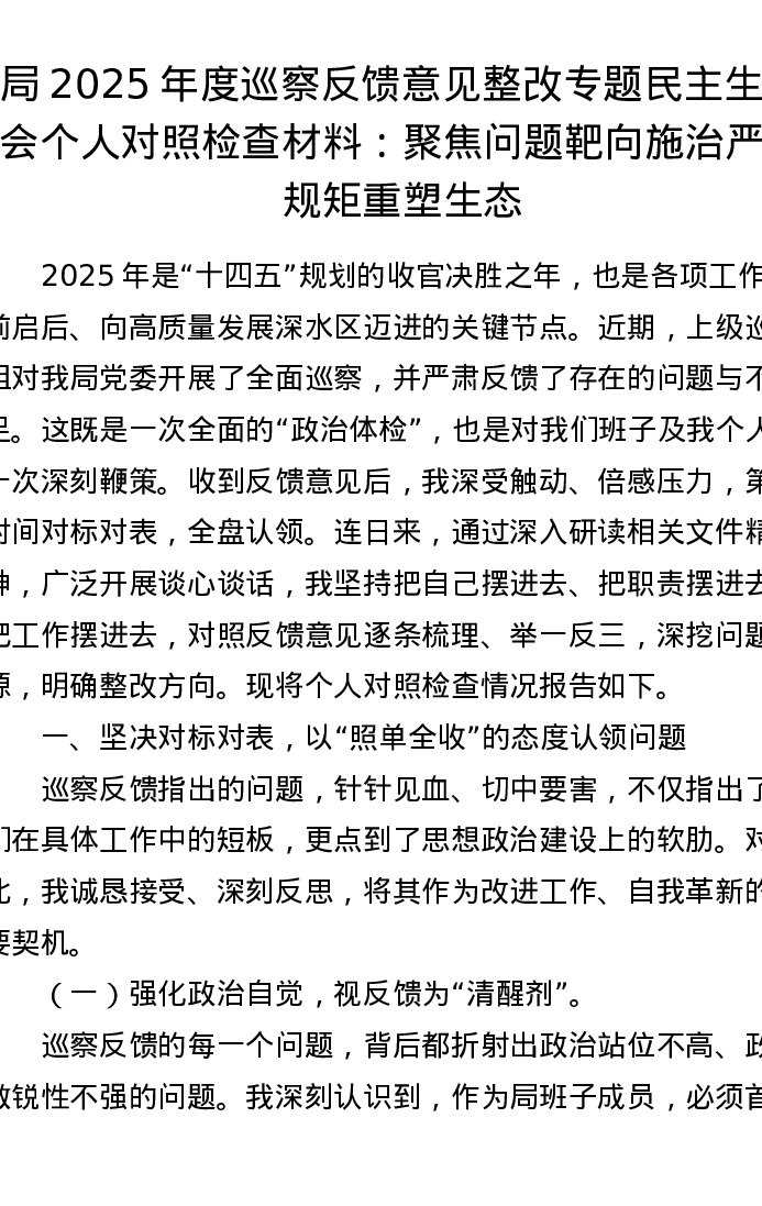局2025年度巡察反馈意见整改专题xxxxx个人对照检查材料:聚焦问题靶向施治 严守规矩重塑生态