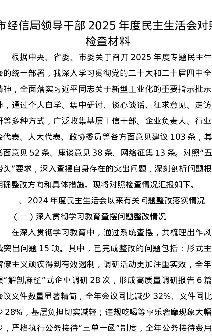 市经信局领导干部 2025 年度xxxxx对照检查材料(含24年整改及正反面案例)