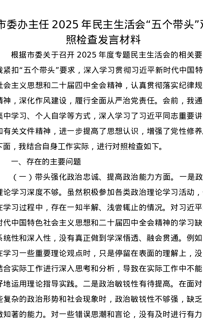 市委办主任2025年xxxxx五个带头对照检查发言材料