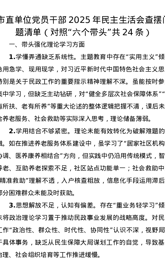 市直单位党员干部2025年xxxxx查摆问题清单(对照六个带头共24条)