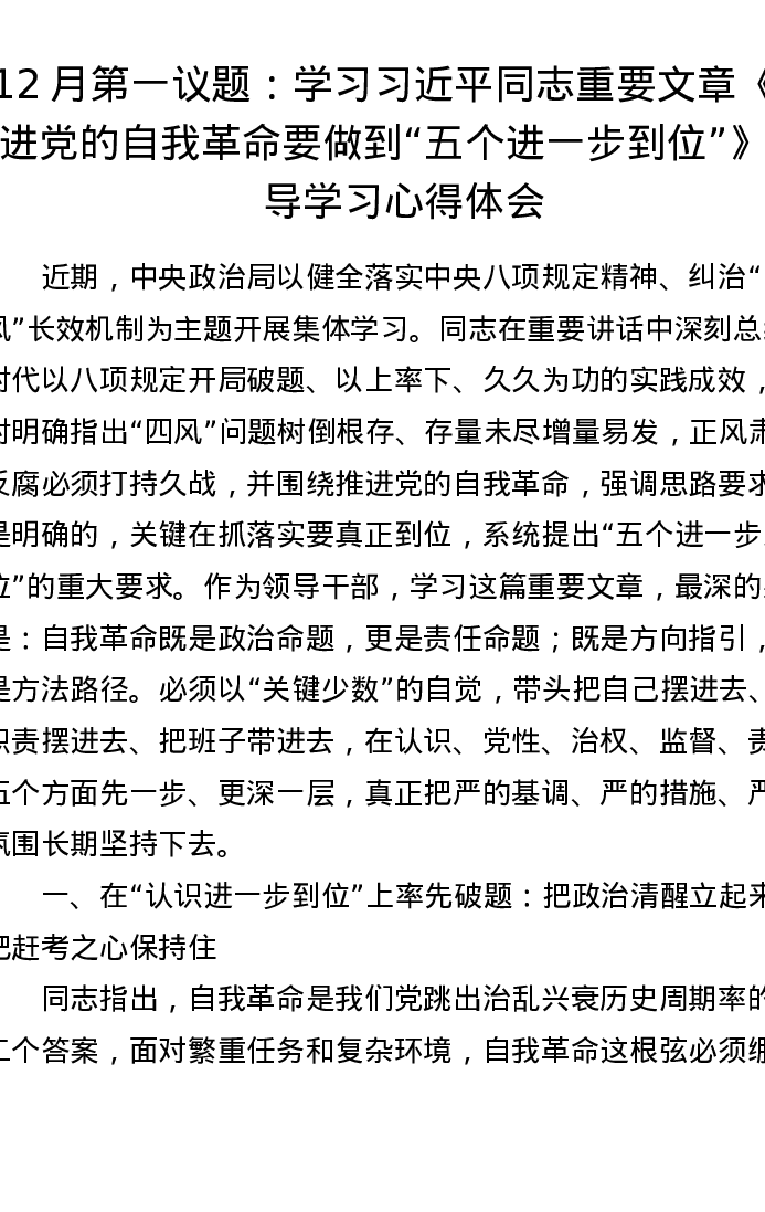 12月第一议题:学习习近平总书记重要文章《推进党的自我革命要做到五个进一步到位》 领导学习心得体会
