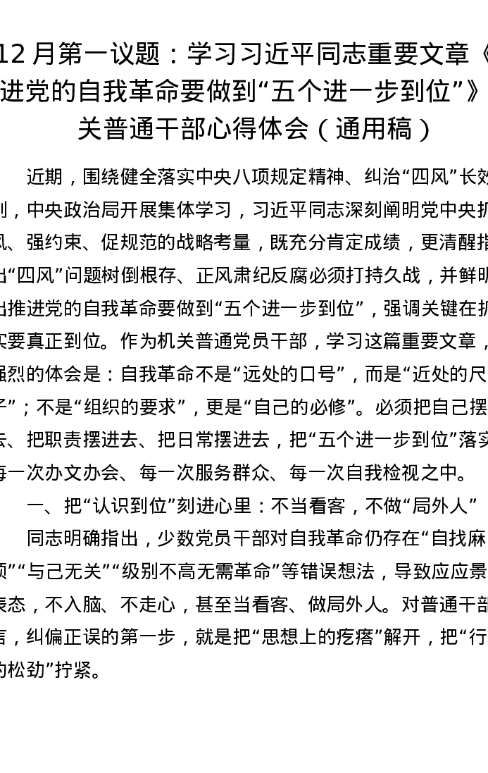 12月第一议题:学习习近平总书记重要文章《推进党的自我革命要做到五个进一步到位》机关普通干部心得体会(通用稿)