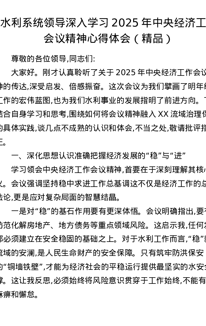 水利系统领导深入学习2025年中央经济工作会议精神心得体会