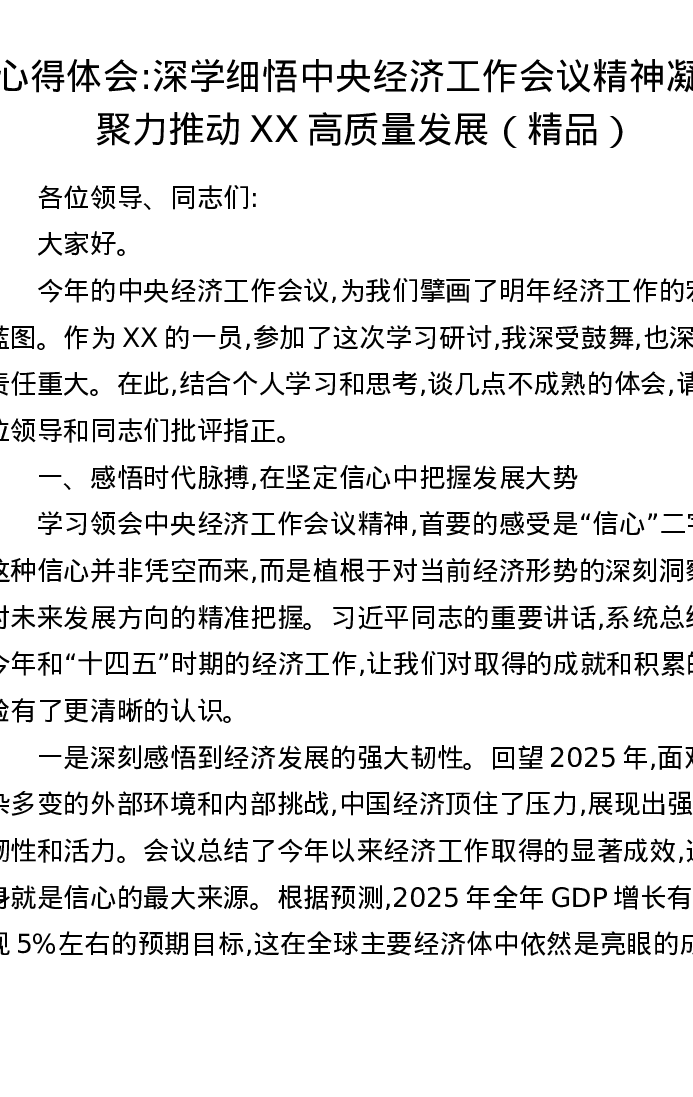 心得体会:深学细悟中央经济工作会议精神凝心聚力推动XX高质量发展