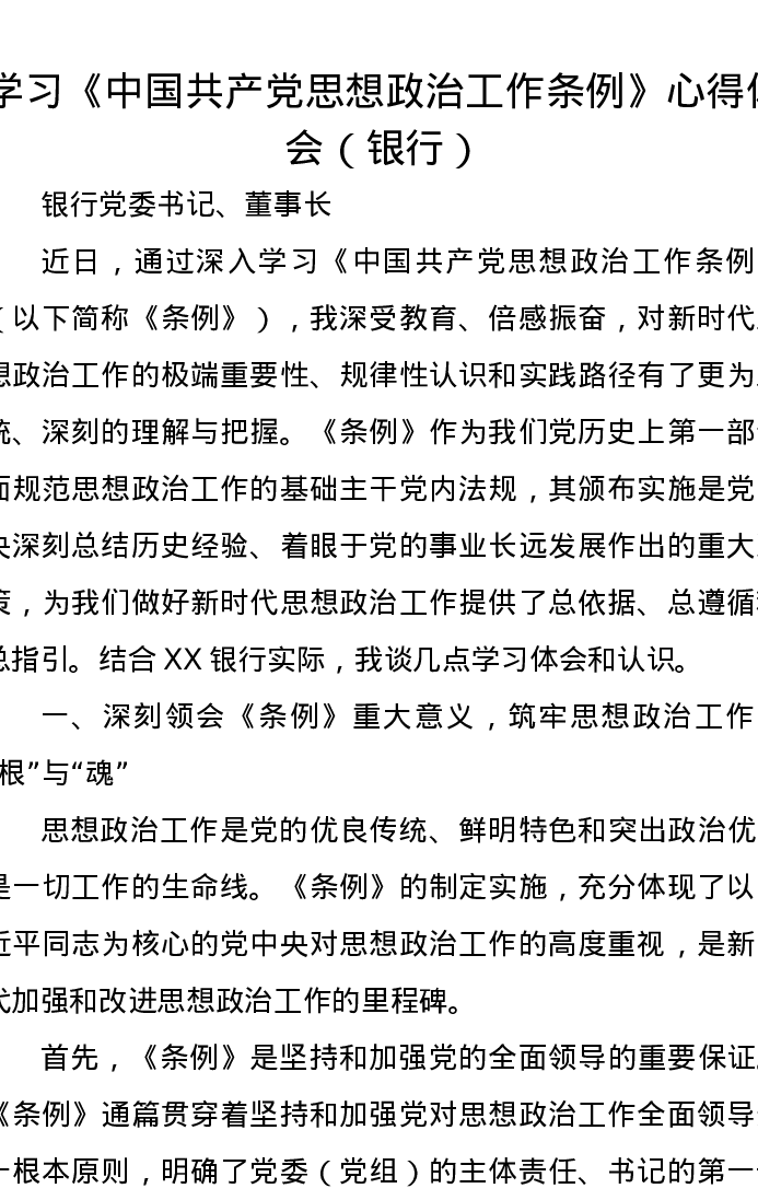 学习《中国共产党思想政治工作条例》心得体会(银行)