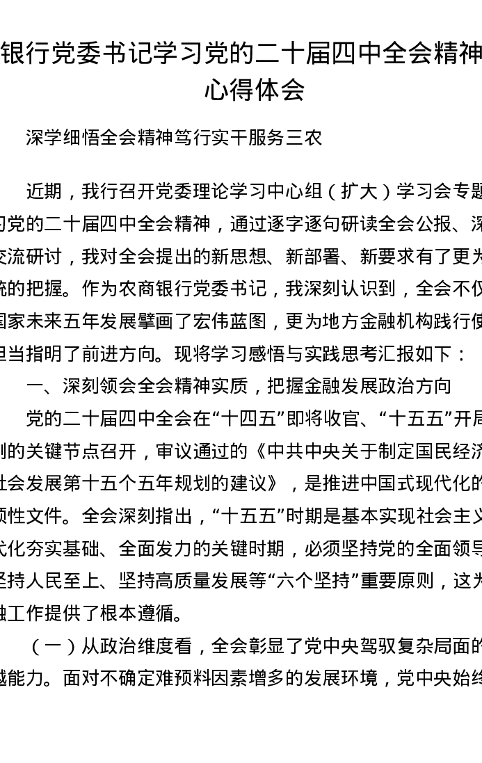 银行党委书记学习党的二十届四中全会精神的心得体会