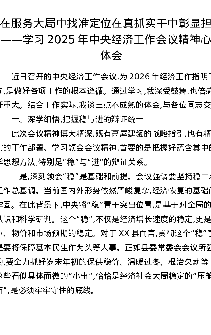 在服务大局中找准定位在真抓实干中彰显担当——学习2025年中央经济工作会议精神心得体会