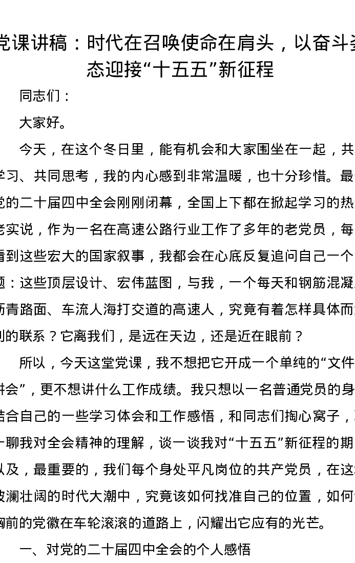 党课讲稿:时代在召唤使命在肩头,以奋斗姿态迎接十五五新征程