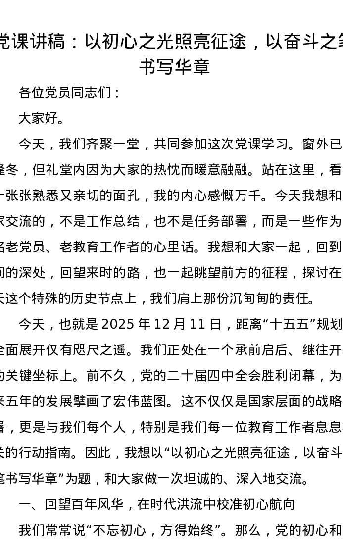党课讲稿:以初心之光照亮征途,以奋斗之笔书写华章