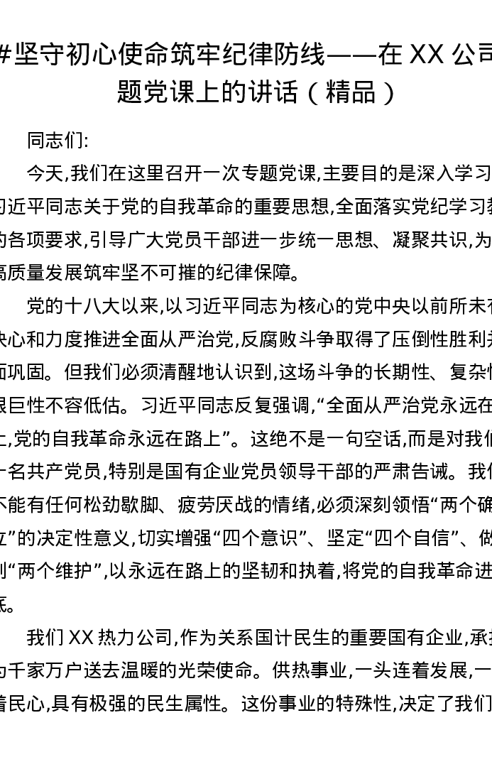 坚守初心使命筑牢纪律防线——在XX公司专题党课上的讲话
