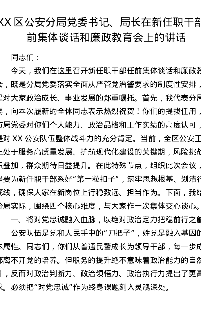 XX区公安分局党委书记、局长在新任职干部任前集体谈话和廉政教育会上的讲话(3631字)