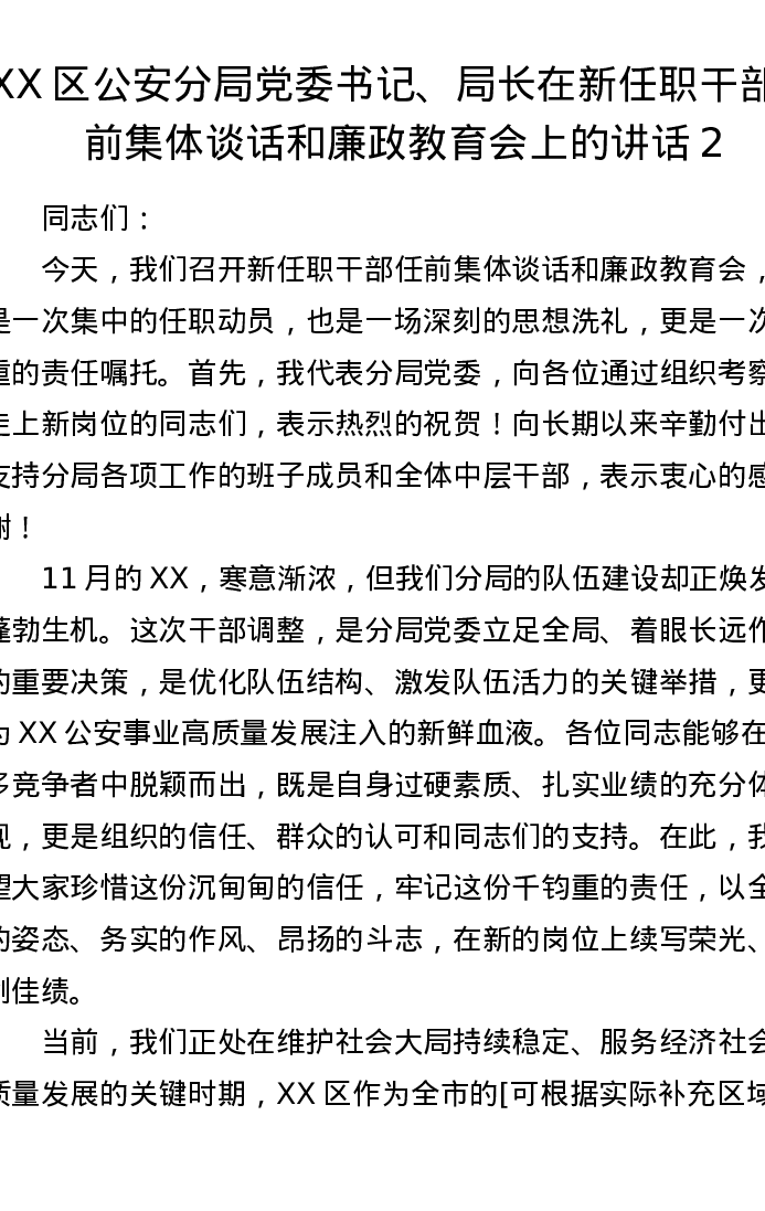 XX区公安分局党委书记、局长在新任职干部任前集体谈话和廉政教育会上的讲话2