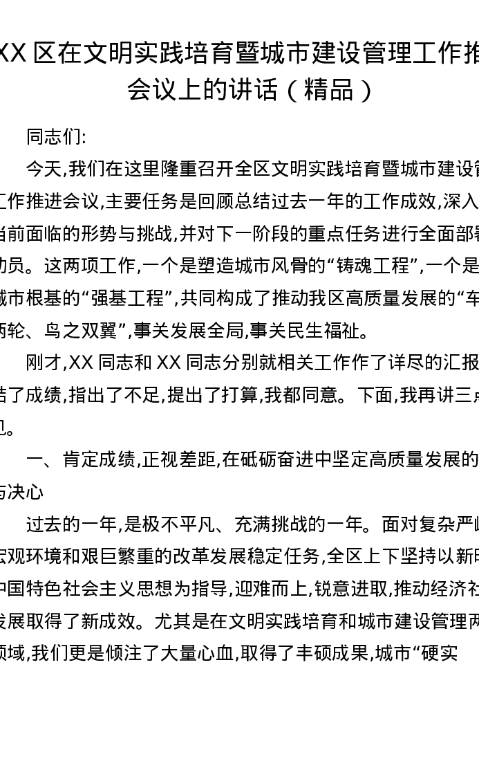 XX区在文明实践培育暨城市建设管理工作推进会议上的讲话