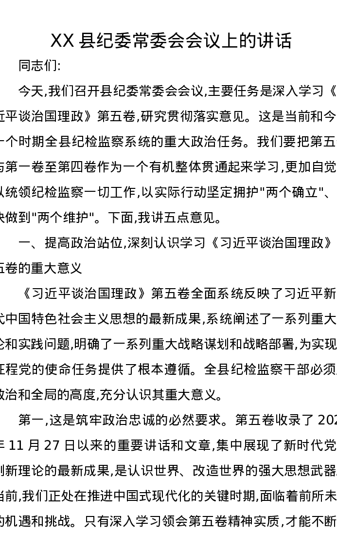 XX县纪委常委会会议上的讲话