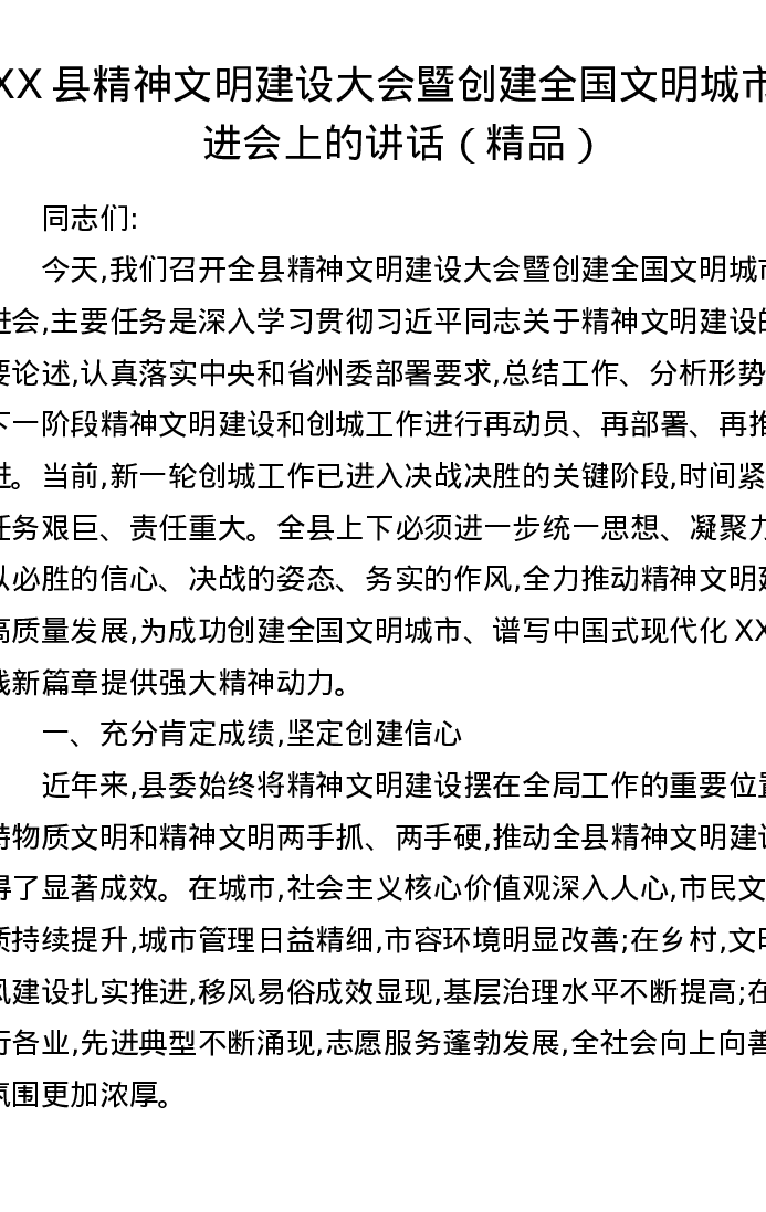 XX县精神文明建设大会暨创建全国文明城市推进会上的讲话