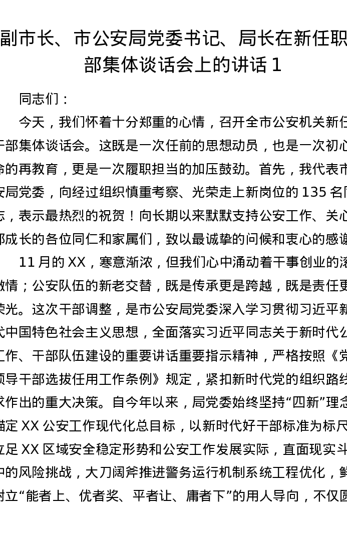 副市长、市公安局党委书记、局长在新任职干部集体谈话会上的讲话1