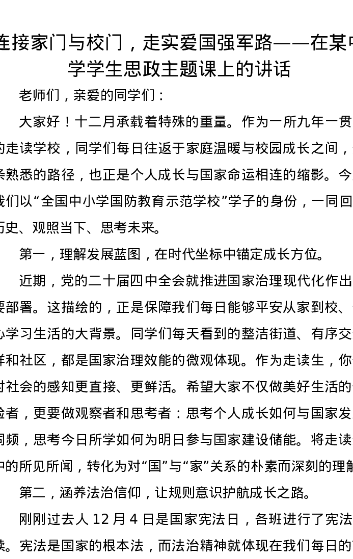 连接家门与校门,走实爱国强军路——在某中学学生思政主题课上的讲话