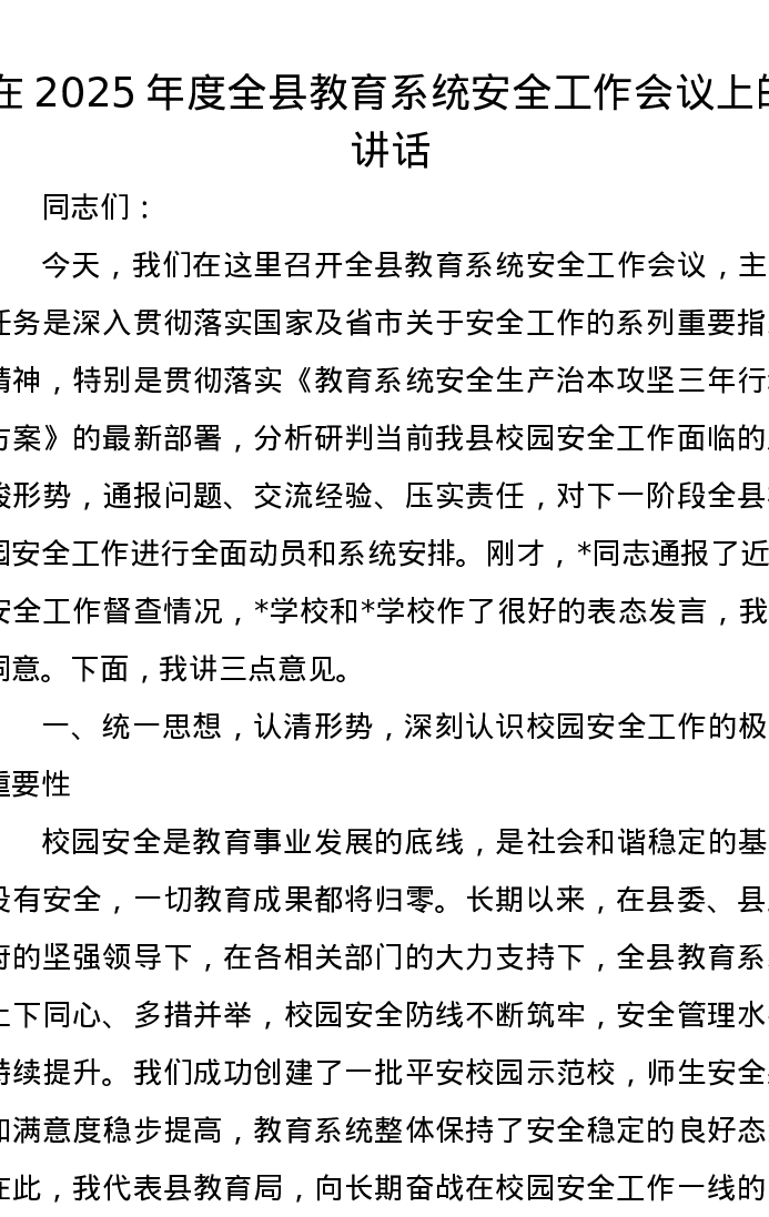 在2025年度全县教育系统安全工作会议上的讲话