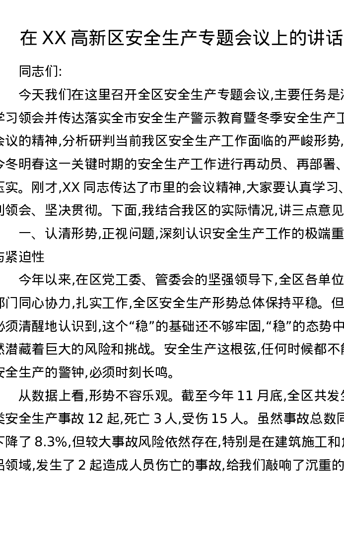 在XX高新区安全生产专题会议上的讲话