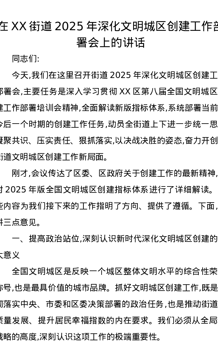 在XX街道2025年深化文明城区创建工作部署会上的讲话