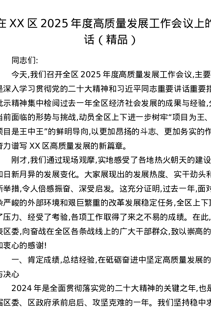在XX区2025年度高质量发展工作会议上的讲话