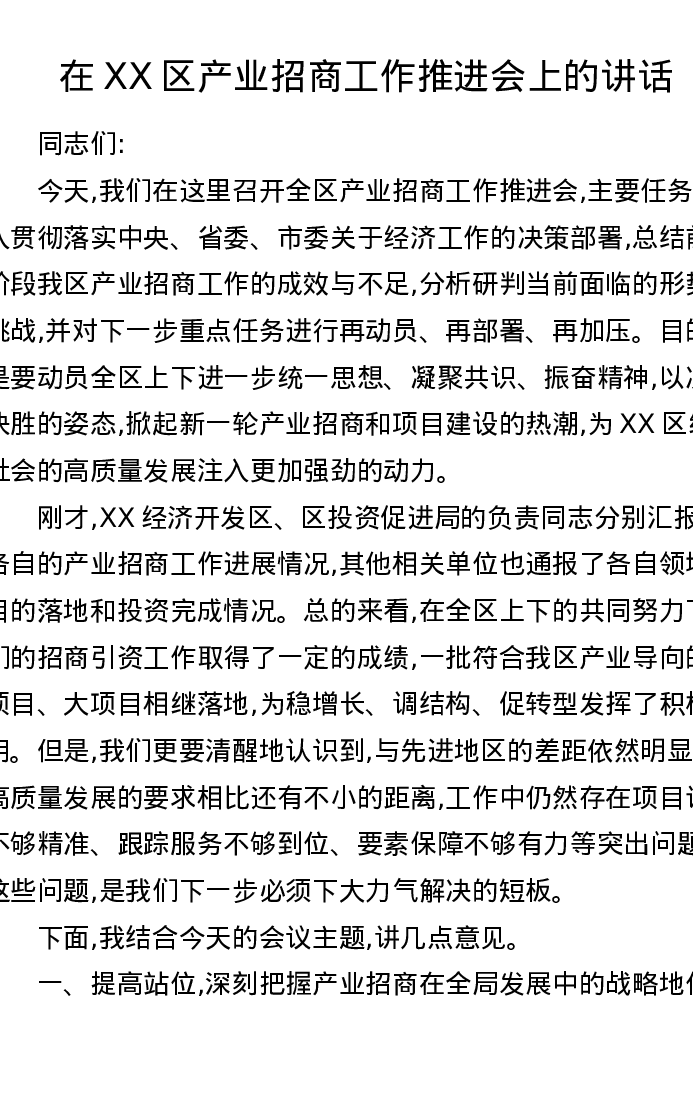在XX区产业招商工作推进会上的讲话