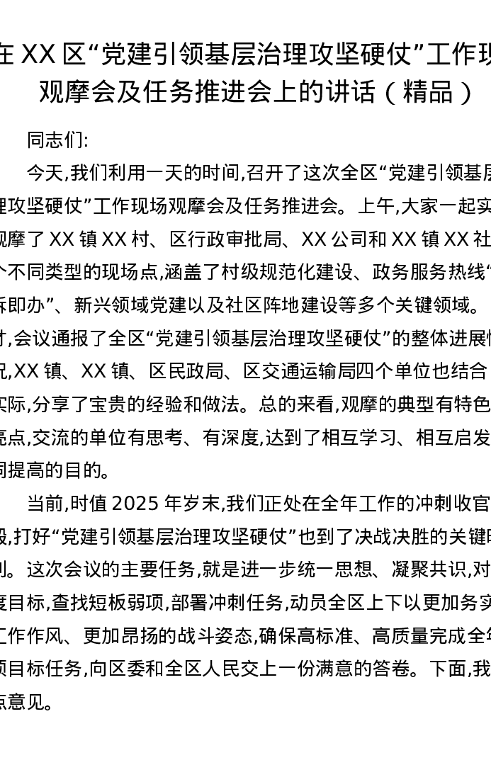 在XX区党建引领基层治理攻坚硬仗工作现场观摩会及任务推进会上的讲话