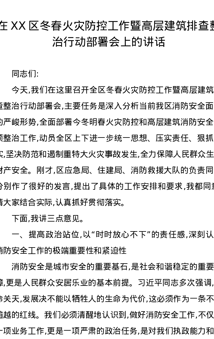 在XX区冬春火灾防控工作暨高层建筑排查整治行动部署会上的讲话