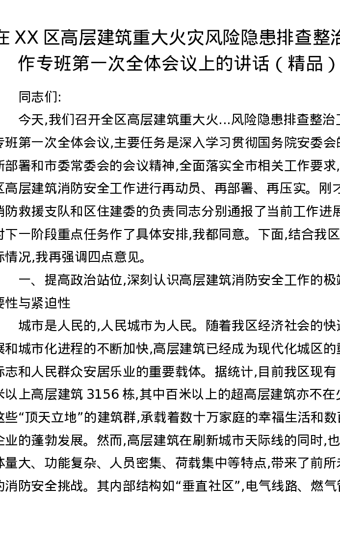 在XX区高层建筑重大火灾风险隐患排查整治工作专班第一次全体会议上的讲话