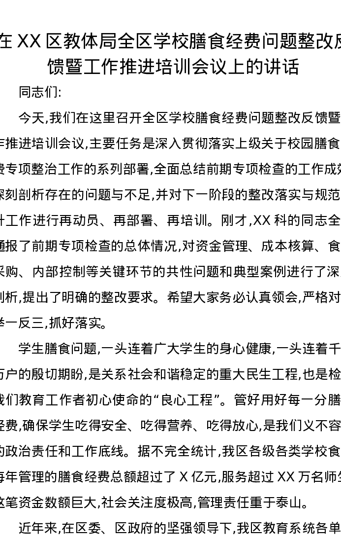 在XX区教体局全区学校膳食经费问题整改反馈暨工作推进培训会议上的讲话