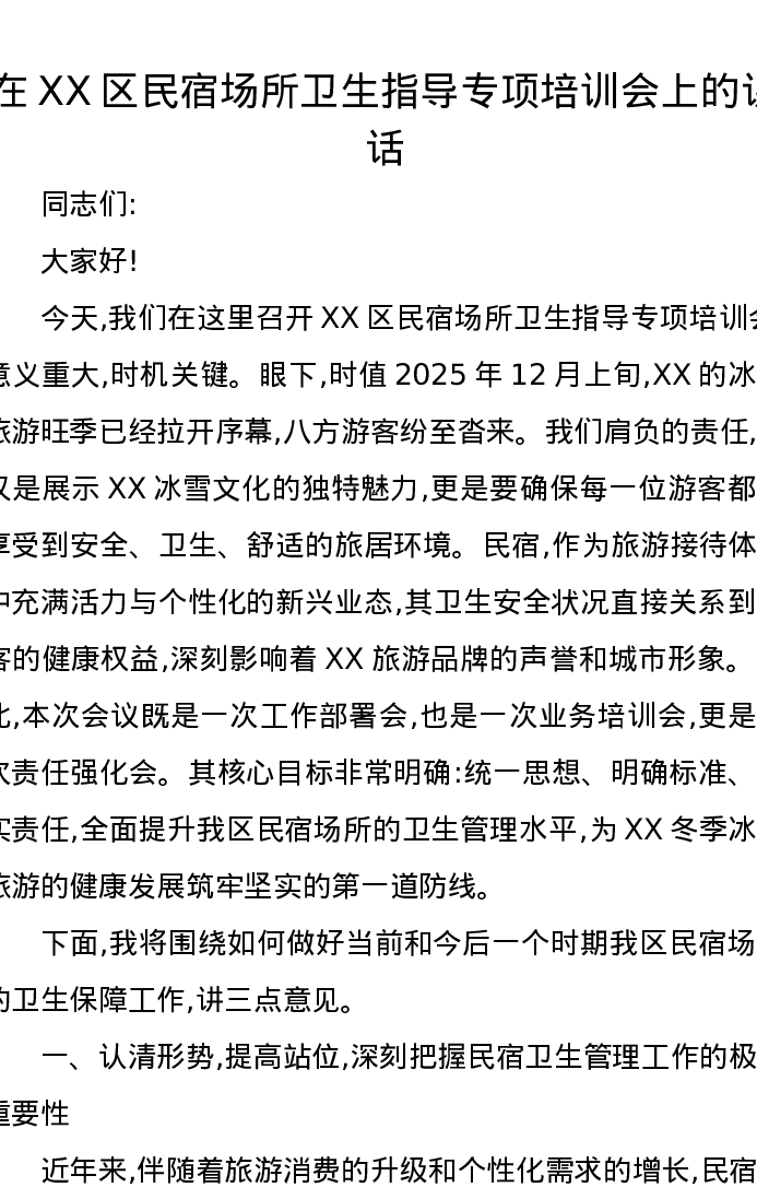 在XX区民宿场所卫生指导专项培训会上的讲话
