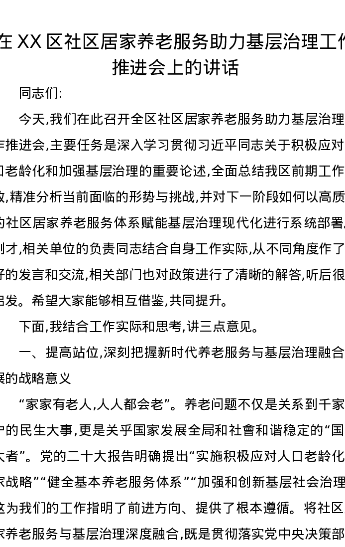 在XX区社区居家养老服务助力基层治理工作推进会上的讲话