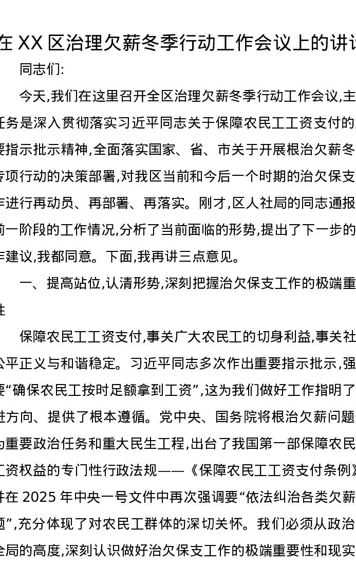 在XX区治理欠薪冬季行动工作会议上的讲话
